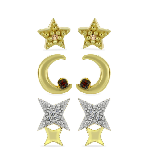 Csillagos Ékszer Szett: Aranyozott Ezüst Fülbevaló Pezsgő és Fehér Gyémánttal ✨ Ez a gyönyörű ékszer szett három pár aranyozott ezüst fülbevalót tartalmaz: egy csillagot pezsogő gyémánttal, egy félholdat gránáttal és egy csillagot fehér gyémántokkal....