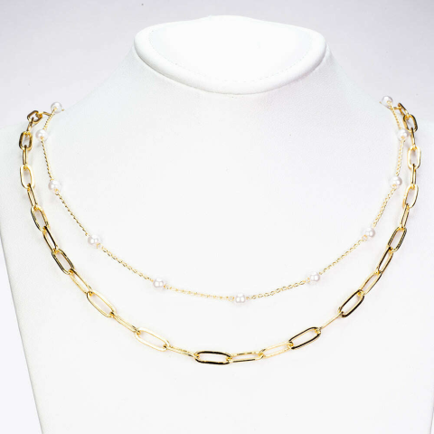 Elegáns Arany Bevonatú Nyaklánc Gyöngyökkel - Kifinomult Stílus Minden Napra ✨ Ez az arany bevonatú nyaklánc gyöngyökkel tökéletes választás, ha egy kis eleganciát szeretnél vinni a mindennapi megjelenésedbe. A finom gyöngyök és az arany bevonat komb...
