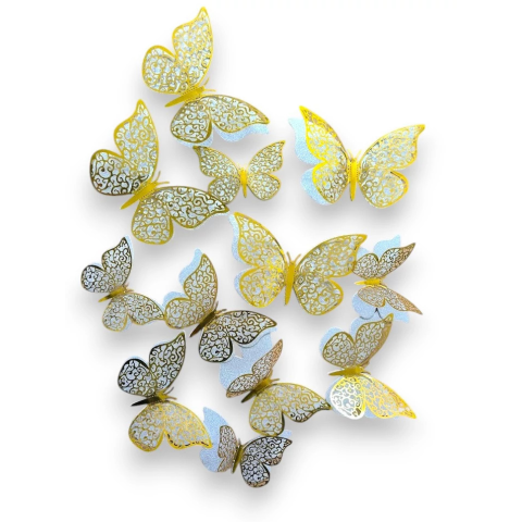 Pillangók mérete: 12*8 cm 10*7 cm és 8*5 cm A 3D pillangó tortadísz szett arany-ezüst színű, 12 db tökéletes választás, ha egy igazán varázslatos és elegáns tortadekorációt keresel. A tortadíszek műanyag és papír kombinációjából készültek