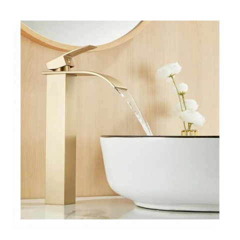 Arany színű magasított csaptelep – WT6658901Ez az elegáns, arany színű magasított csaptelep modern és luxus megjelenést biztosít a fürdőszobában. A letisztult, szögletes kialakítás és a vízesés hatású kifolyó stílusos és praktikus megoldás mosdókagylókhoz.A 31 cm-es magasságának köszönhetően ideális magasabb mosdókhoz, könnyen kezelhető egykaros vezérléssel, amely precízen szabályozza a víz hőmérsékletét és erősségét. Tartós, korrózióálló a