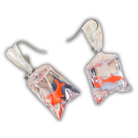 Egyedi aranyhalas zacskó fülbevaló, amely vicces és különleges megjelenést kölcsönöz. Tökéletes ajándék halrajongóknak és divatkedvelőknek