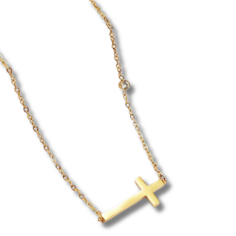 Stílusos aranyozott acél fekvő keresztes nyaklánc strasszkő díszítéssel. Elegáns és állítható női nyaklánc minden alkalomra