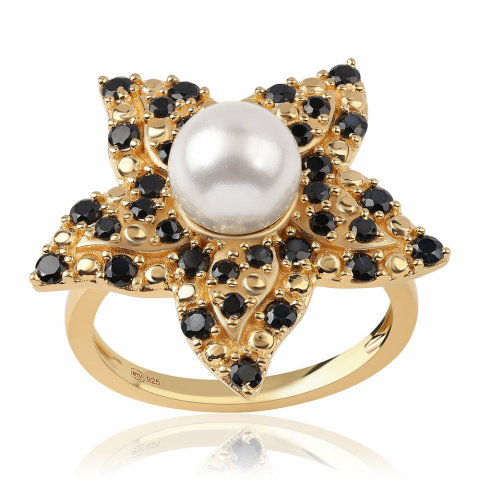 1 kép Aranyozott Ezüst Gyűrű Fekete Spinellel és Édesvízi Gyönggyel