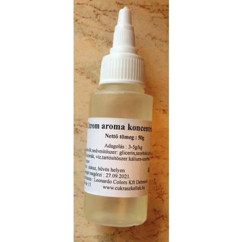 Aroma Koncentrátum – Citrom Ízű, 50g Frissítsd fel desszertjeidet és italjaidat a Aroma koncentrátum 50g citrom használatával! Ez a prémium minőségű koncentrátum erőteljes, természetes citrom ízt biztosít, amely tökéletesen illik süteményekhez, tortákhoz