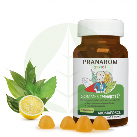 Aromaforce Junior - immunerősítő gumicukor - 60db - Pranarom 6 éves kortól Az Aromaforce Junior immunerősítő, puha gumicukor ravintsara, citrom, édesnarancs, gyömbér, borsmenta és kínai fahéj illóolajokkal. A gyömbér és a borsmenta illóolajok hozzájáruln