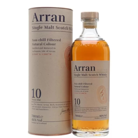 Az Arran-sziget 10 éves single malt whisky-je eredetileg 2006-ban indult, 2019-ben új dizájnnal és új recepttel váltotta fel. Az Arran 10 éves egy közepes testű, citrusos dráma, amely olyan eleganciát mutat, amely meghazudtolja a szeszfőzde fiatalságát. K