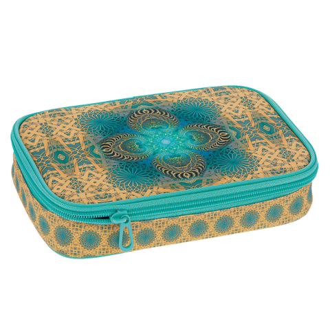 Nagyméretű, praktikus tolltartó arany és türkiz színű mandala mintával. Belsejében a hagyományos írószertartók mellett plusz zsebet is elhelyeztünk a legfontosabb írószerek és kincsek számára. Tudj meg róla még többet