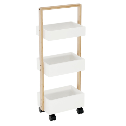 A természetes bambusz és a fehér szín kombinációja bármely helyiségnek modern designt kölcsönöz. A kerekeknek köszönhetően a kozmetikai kocsi praktikus és egyszerűen használható.