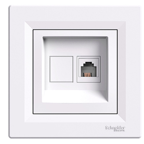 A Schneider Electric Asfora 1xRJ11 telefonaljzat EPH4100121, fehér színű, komplett szerelvény. A készülék rögzítőkörömmel ellátott. A telefonaljzat mérete 83 mm, 83 mm és 38 mm, kiálló mélysége 9 mm. Süllyesztett szerelés is lehetséges, vagy kiemelődobozba is felszerelhető. A felületkialakítása fényes és egy elegáns felső kategóriás kapcsoló érzetét kelti. Az aljzat betűzős bekötésű. Az eszköz IP44-es védettséggel rendelkezik. Az ABS (akrilnitril-butad