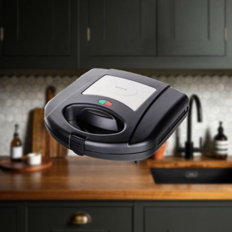 A 780 W-os, fekete színű 3 az 1-ben szendvicssütő könnyen tisztítható tapadásmentes felülettel, 3 pár szilárd lemezzel – szendvicssütő, grill és gofrisütő – rendelkezik. A könnyű kezelhetőség érdekében tányérzárral, hőszigetelt fogantyúval, működési/készségjelző lámpával és csúszásmentes lábakkal van felszerelve.