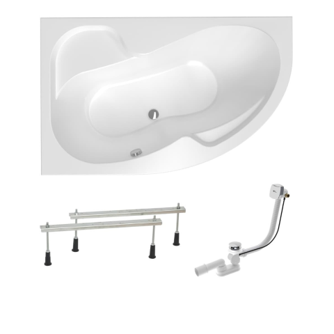 Akrilból készült aszimmetrikus kád, anyagvastagság 5 mm. A kád megnevezése - bal oldali tájolás. A kád térfogata 220 liter. Szifonnal, túlfolyóval és lábakkal együtt.