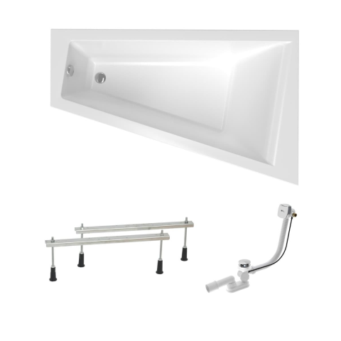 Aszimmetrikus kád akrilból, anyagvastagság 5 mm. A kád megnevezése - jobb oldali tájolás. A kád térfogata 200 liter. Szifonnal, túlfolyóval és lábakkal együtt.