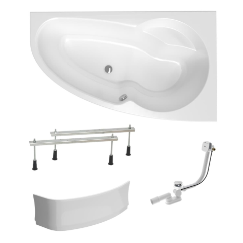 Aszimmetrikus kád akrilból készült, anyagvastagsága 3,2 mm. A fürdőkád megnevezése - jobb oldali tájolás. A kád térfogata 170 liter. Szifonnal, túlfolyó töltéssel, lábakkal, előlappal és oldallappal együtt.