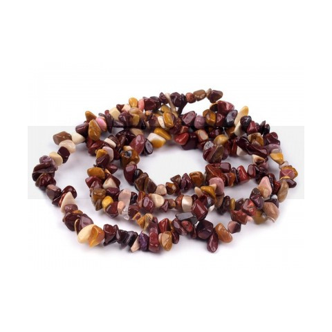 A termé,szetes á,svá,nyi tö,rmelé,kek a legvariá,lható,bb bizsuelemek. A jaspis mookait egyedi szí,nezé,sű é,s mintá,jú,.Egy zsinó,ron kb. 230 kő van.A mintá,zata é,s a szí,ne elté,rő lehet, mivel termé,szetes anyagró,l van szó,. Hossz: 85 cm Szé,lessé,ge: 3 - 10 mm Lyuk: 1 mm Nem alkalmas 3 é,ves kor alatt belé,legzé,s veszé,lye ,ö,
