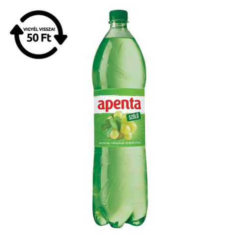 Ásványvíz szénsavas APENTA szőlő 1,5L DRS Apenta Szőlő szénsavas üdítőital természetes ásványvízzel, kevesebb, mint 1% gyümölcslével Összetevők: Apenta Mineral természetes ásványvíz, glükóz-fruktózszörp (G)* és/vagy cukor (D)*, szén-dioxid (min. 3,0