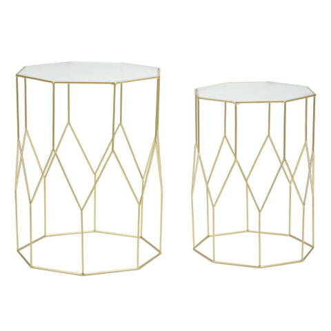 Elegáns, arany fém dohányzóasztal szett üveglap tetejével Ez a 2 darabos dohányzóasztal szett tökéletes választás modern és elegáns otthonokba. A finom arany fém váz geometrikus mintázata stílusos megjelenést kölcsönöz, míg az üveg lapok elegáns kont...