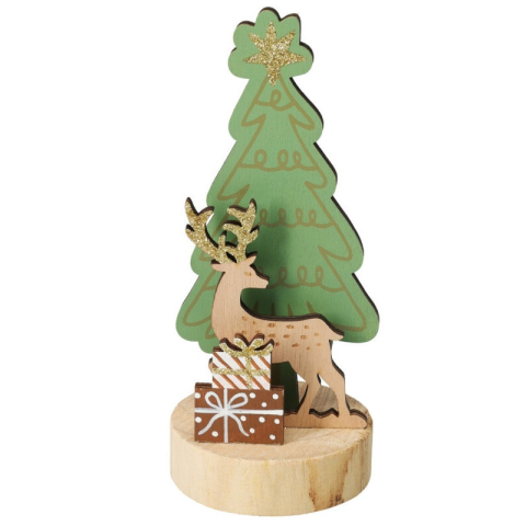 Asztaldísz -fa zöld fenyő szarvassal, barna ajándékokkal fajáték 1 kép