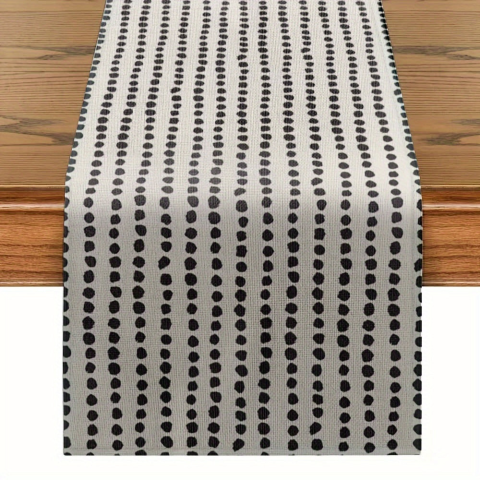 Fedezd fel a stílus és elegancia új szintjét ezzel a lenyűgöző asztali futóval, amely fekete pöttyökkel díszített. Ez a modern és kifinomult asztali dekoráció tökéletes választás bármilyen étkezőasztalra vagy dohányzóasztalra, hogy egyedi hangulatot terem