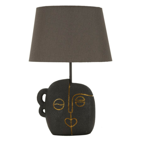 Törzsi arcú asztali lámpa: Egyedi stílus a nappaliba ✨ Ez a különleges asztali lámpa egyedi, törzsi arcot formázó alappal rendelkezik, aranyozott részletekkel díszítve. A sötét szürke szövet lámpabúra tökéletesen kiegészíti a lámpatest egyedi designj...