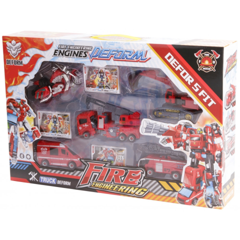 Változtasd át robottá a tűzoltó járműveket! Az Átalakuló autó 5 az 1-ben készlet egy műanyagból készült motort, furgont, daruskocsit, létrás autót és markolót tartalmaz, a tűzoltóság színeiben. Az autókat át tudod hajtogatni robottá, a kártyákon láthatod, hogy mi lesz a végeredmény a járművekből. A járművek élethűek, és együtt tudod használni őket más autós játékokkal, készletekkel is. Az Átalakuló autó 5 az 1-ben készlet csomagolási méretei: