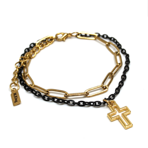 Tedd fel kérdésed a(z) Áttört kereszt charmos dupla karkötő, arany-fekete színű termékről!
