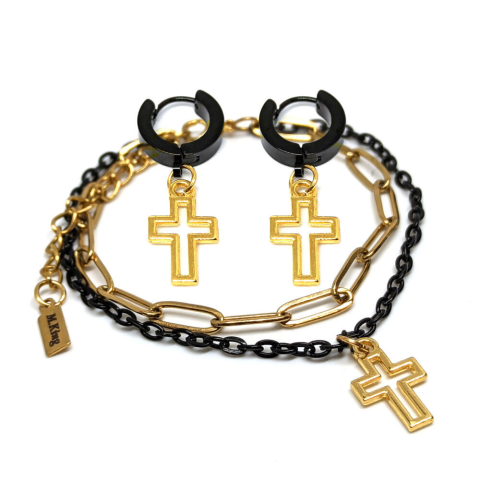 1 kép Áttört kereszt charmos dupla karkötő + fülbevaló szett, arany-fekete színű