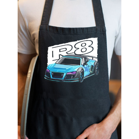 Audi ajándékok, Audi R8 kötény. Kötény nőknek és férfiaknak egyedi Audi R8 grafikával. Ajándék a Audi R8 tulajdonosoknak és rajongóknak, a sebesség megszállottjainak. Fekete és fehér kötényeink közül válaszd ki a neked tetszőt és mi küldjük is neked a tök