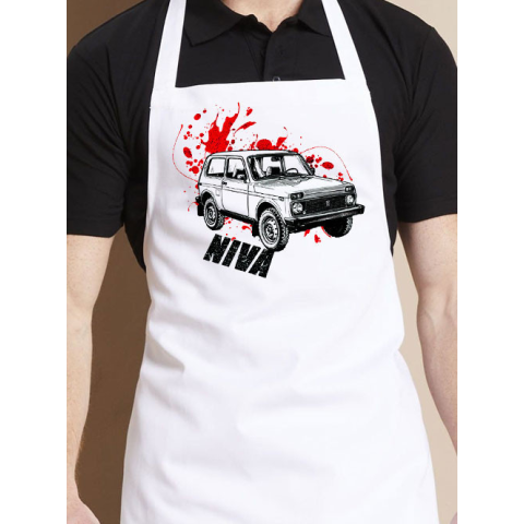Autós ajándék, Lada Niva kötény. A VAZ–2121, mai nevén Lada 4x4 az 1970-es években terepjárásra kifejlesztett autómárka. Minden retro autó kedvelőnek ajánljuk születésnapi, névnapi ajándékként. A kötény fekete és fehér színben is választható a minta szín