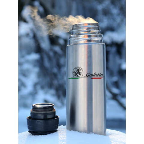 Autós ajándékok, Alfa Romeo Giulietta termosz. Alfa Romeo Giulietta mintás termosz, autós meglepetés alfásoknak. Olasz zászló színeivel, visszafogott, elegáns minta Alfa logóval. Anyaga fém és műanyag. Stílusos és praktikus rozsdamentes acél termosz, a