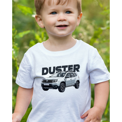 Autós gyerek pólók, Dacia. Ha imádod a Dacia Duster robusztus megjelenését és megbízhatóságát, akkor ezt a gyerek pólót neked találták ki! A póló középpontjában egy részletgazdag, modern Duster illusztráció áll, amely minden autórajongó szívét megdobogtat
