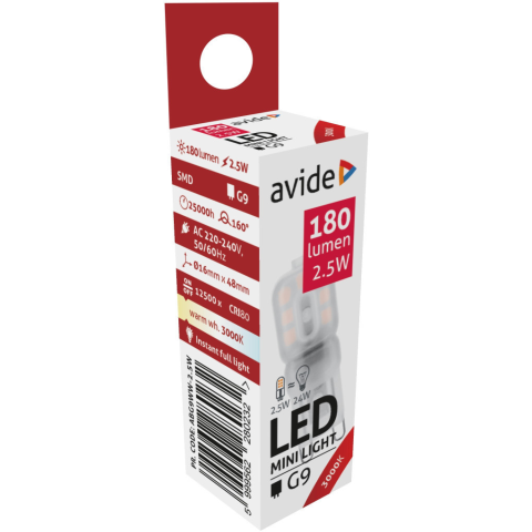 Avide LED 2.5W G9 WW 3000K Az Avide LED-fényforrások a hagyományos izzókat helyettesítő magas hatékonyságú LED-ek. Tökéletesek háztartásokban található világítástechnikai megoldások lecserélésére. Többféle formában érhetők el, mint például különböző mé