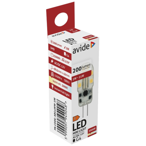 Avide LED 2W G4 WW 3000K Az Avide LED-fényforrások a hagyományos izzókat helyettesítő magas hatékonyságú LED-ek. Tökéletesek háztartásokban található világítástechnikai megoldások lecserélésére. Többféle formában érhetők el, mint például különböző mére
