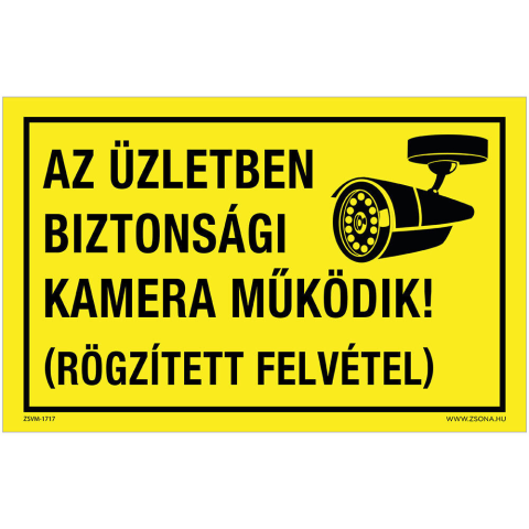 Az üzletben biztonsági kamera működik! Öntapadós matrica 160x250 mm információs tábla, állvány 1 kép