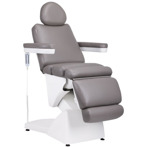 A modern, szürke színű AZZURRO 878 elektromos kozmetikai kezelőszék alkalmas minden kozmetikai eljáráshoz, tetováláshoz, sminkeléshez és masszázskezeléshez. Elektromosan állítható magasságú és háttámlájú szék, állítható ülés dőlésszöggel (bölcső opció) és lábtámlával. A távirányítós pozícióba állítás lehetőségének köszönhetően a pozicionálás még inkább leegyszerűsödik. A kozmetikai szék kartámlákkal rendelkezik, amelyek szükség ese