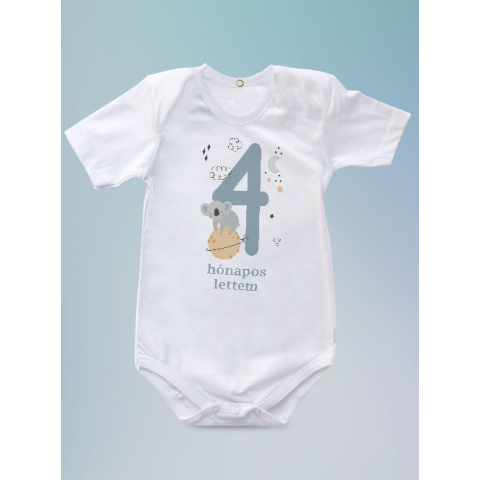 Koalás body, mérföldkő, 4 hónapos lettem. A negyedik hónap is eljött – és ezzel újabb csodás pillanatok a baba életében! Ez a „4 hónapos lettem” feliratú baba body egy édes, koalás mintával teszi még különlegesebbé ezt a mérföldkövet. A holdas és csillago