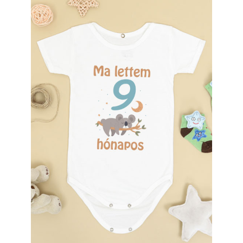 Baba ajándék, feliratos body, 9 hónapos lettem koalás body. Ahogy a baba egyre ügyesebb és mozgékonyabb, úgy válik még különlegesebbé minden pillanat. A „Ma lettem 9 hónapos” body egy aranyos koalás grafikával örökíti meg ezt az időszakot. Ajándéknak, fot