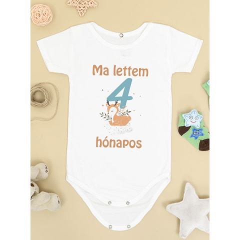 Baba ajándék, feliratos body, 4 hónapos lettem őzikés baba body a „Ma lettem 4 hónapos” felirattal nemcsak stílusos, hanem igazán szívmelengető ajándék is. Tökéletes választás egy havi emlékfotóhoz vagy ha feliratos ajándékot keresel egy pici számára. Puh