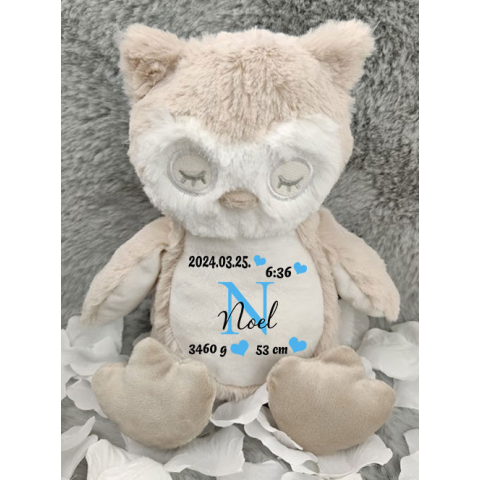 Baba emlékőrző ajándék, plüss bagoly. Aranyos, puha plüss bagoly újszülött kisbabáknak, szülőknek. Kiváló ajándék, mely a kisbaba adataival örök emlékként és kedvenc plüssfiguraként is tökéletes névre szólóan minden gyereknek. A felirat színe a baba nevé