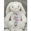 Baba emlékőrző ajándék, plüss fehér nyuszi. Aranyos, pihe-puha plüss nyuszi újszülött kisbabáknak, szülőknek. Kiváló ajándék, mely a kisbaba adataival örök emlékként és kedvenc plüssfiguraként is tökéletes névre szólóan minden gyereknek. A felirat színe