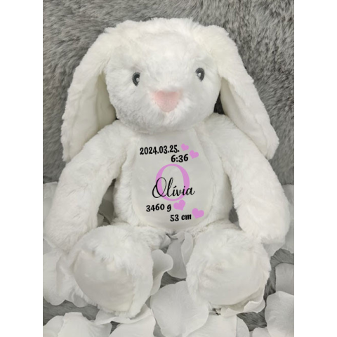Baba emlékőrző ajándék, plüss fehér nyuszi. Aranyos, pihe-puha plüss nyuszi újszülött kisbabáknak, szülőknek. Kiváló ajándék, mely a kisbaba adataival örök emlékként és kedvenc plüssfiguraként is tökéletes névre szólóan minden gyereknek. A felirat színe