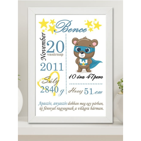 Baba emlékőrző, nagy falikép fiús grafikával keresztelőre keresztszülőknek, de anyukáknak, apukáknak is tökéltes meglepetés. Töltsd ki figyelmesen az adatokat, mert pontosan azok fognak a képre kerülni. Mérete 30x40 cm. Ebben a méretben csak fehér színű k