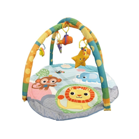 Baba játszószőnyegfüggő formákkalrágókávalmintás, színes felülettelpamutból készültBaba játszószőnyegünk már újszülött kortól alkalmas a legkisebbeknek is. A szőnyeg pamutból készült, körülbelül fél cm vastagságú, így a kisebbek és a kicsit nagyobbak is kényelmesen játszhatnak rajta, nem fáznak fel a hideg padlón. A játszószőnyeghez rögzíthető játékhidakra különböző függő plüssök rögzíthetők. A színes formák segíthetik fejleszteni a k