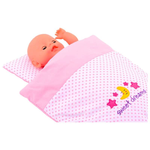 Segíts a játékbabának pihenni, párnával és takaróval! A Baba párna és paplan készletben egy Sweet Dreams feliratú, pöttyös mintájú pici párnát és egy vastag paplant találsz, amik segítenek kedvenc játékbabádnak elaludni. A paplan és a párna puha textilből készült, a játék bármelyik 45 cm-es, vagy kisebb játékbabával együtt használható. A paplan méretei: 32 x 36 cm, párna méretei: 19 x 14 cm.