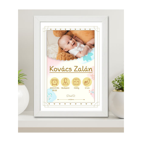 Babaköszöntő falikép, ajándék babaszületésre. Emlékőrző ajándék újdonsült anyukáknak és apukáknak. Az újszülött baba adatainak és fotójának kiváló őrzésére szolgál egy ilyen falikép, ami a babaszoba tökéletes dekorációja is egyben! Töltsd ki figyelmesen a