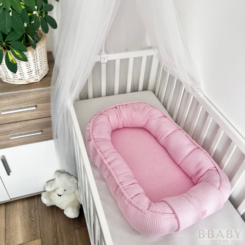 1 kép Babarózsaszín waffle babafészek – 100% pamut, légáteresztő, I. osztályú babatextil