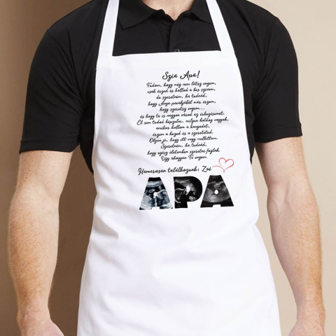 Különleges és viccesen megható ajándék, amelyben a leendő apuka is örömmel sürög-forog majd a konyhában.A „Apa leszel!” mintás kötény 3 saját ultrahangfotóval és névvel személyre szabható, így örök emlékké válik.Ajándékötlet: egészítsd ki bögrével és póló
