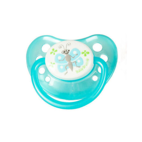 BabyBruin Játszócumi Pillangó, kék szilikon fogszabályzós (méret: 1) 0 - 6 hó Kiszerelés: 6 csomag/karton.BabyBruin fogszabályzós játszócumi (1-es) kékOrtodontikus kialakítású szilikon játszócumi 0-6 hónapos korig kék színben, pillangó mintával. Kiváló