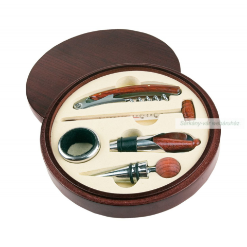 5 részes,kerek alakú boros szett fa díszdobozban. Méret:ø170×35 mm Emblémázási méretek: Max. átmérő:100mm Rendelésre: 6-10 nap!