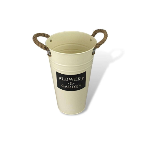 "Flowers & Garden" feliratos magasított bádog váza, kötél fülekkel. Strapabíró, nagyobb csokrokat is könnyen befogadó virágtartó. Méret: 16x25cm, talp átmérő: 10cm, tető átmérő: 16cm