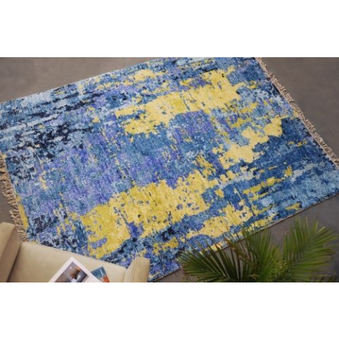 Iconic Kézi Csomózású Szőnyeg - Kék és Arany Absztrakt Mintával (160x230 cm) 💙💛 Élvezze a luxust és a művészi kivitelezést az Iconic kollekció kézi csomózású szőnyegével. Ez a modern, absztrakt mintázatú szőnyeg nem csupán egy padlóburkolat, hanem e...